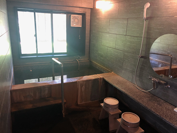 「宝殿」の内風呂は、自家源泉から湧き出る鳥取温泉の湯を、かけ流しで贅沢にお楽しみいただける特別仕様。とろみのある無色透明の湯が、肌にやさしく心までほぐしてくれます。浴室内も広く設計されており、車いす利用者の方にも配慮された構造となっています。ご滞在中、何度でも自分だけの温泉時間をご満喫ください。